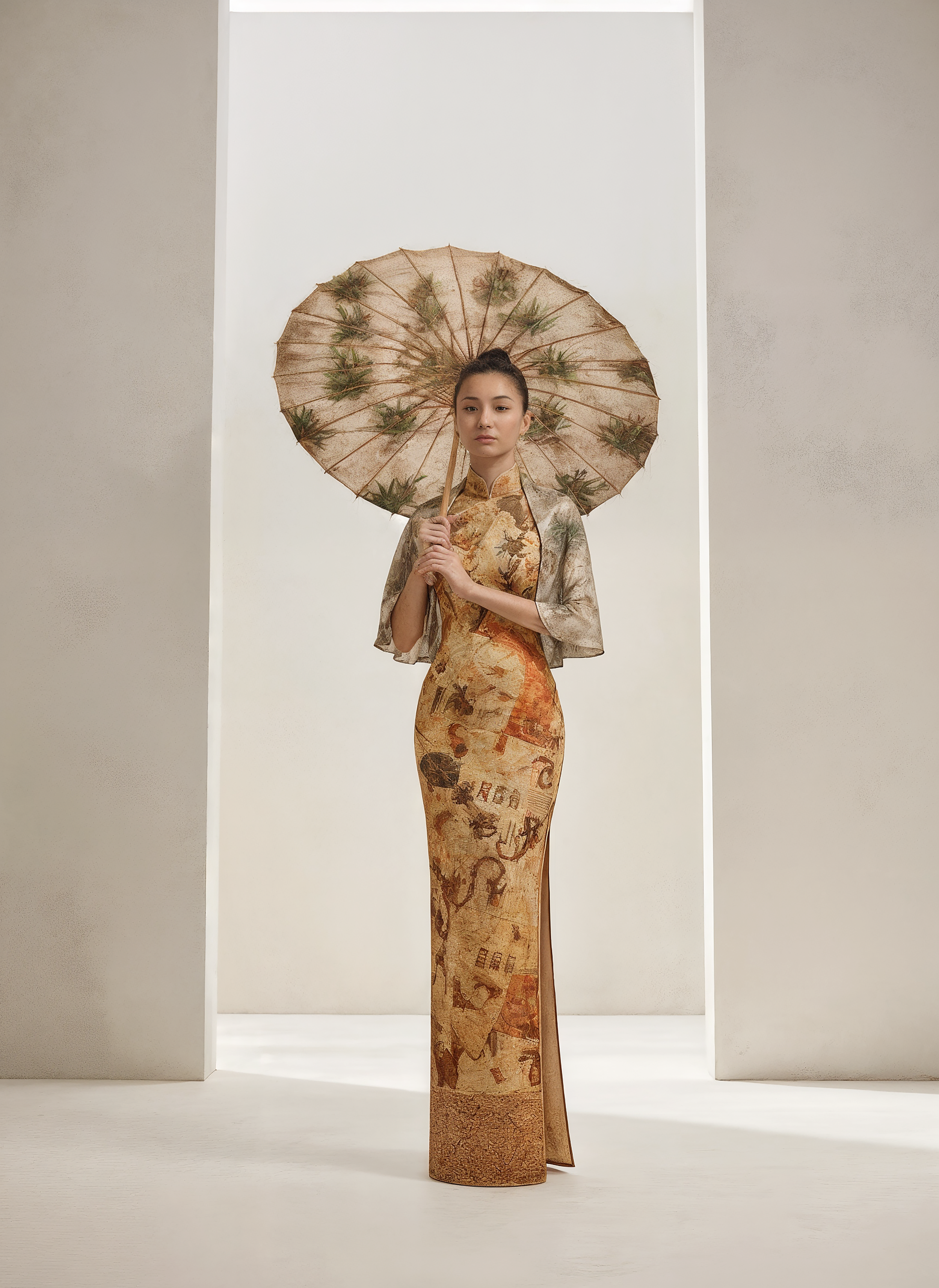 The collaboration manifests through two complementary designs that embody the intersection of photography, architecture, and fashion. The Sheikh Zayed Line features an abaya printed with Al Attar Tower's photograph, capturing Dubai's architectural evolution where global modernism merges with regional form. The Irrigated Desert adopts the qipao form, printed with images of irrigated desert plants—geometric rows of green life sustained by drip-feed hoses. The silk satin fabric references China's ancient silk-making heritage, while photographic details of scorpions recall their role in Chinese medicine. Together, these designs translate the Silk Road's historical exchange of materials, knowledge, and aesthetics into contemporary wearable archives, transforming architecture into textile and geography into pattern.